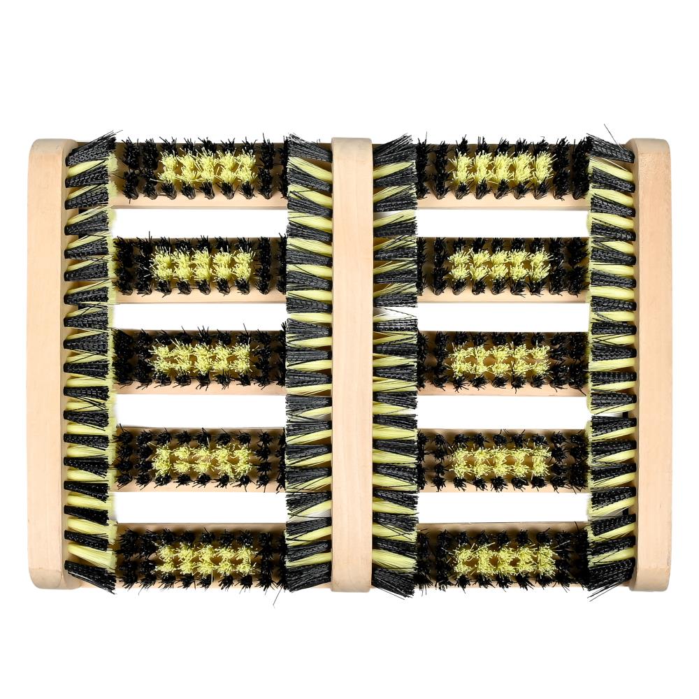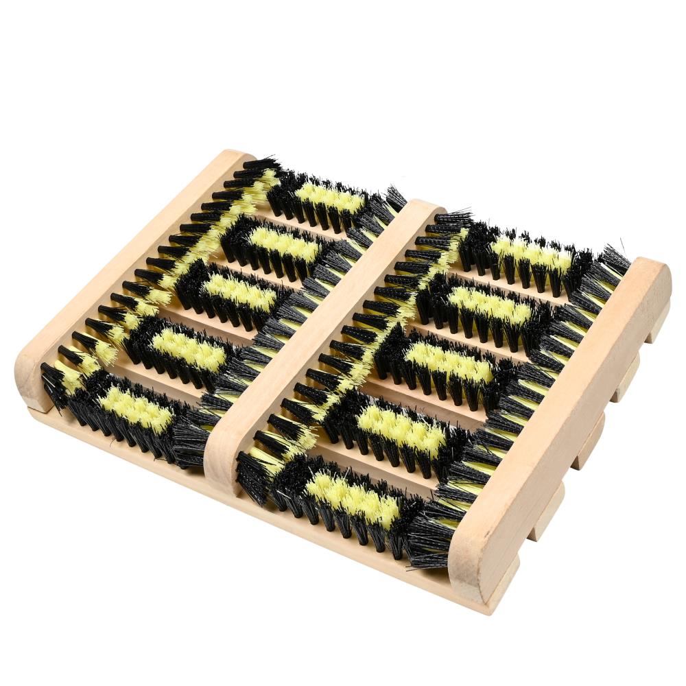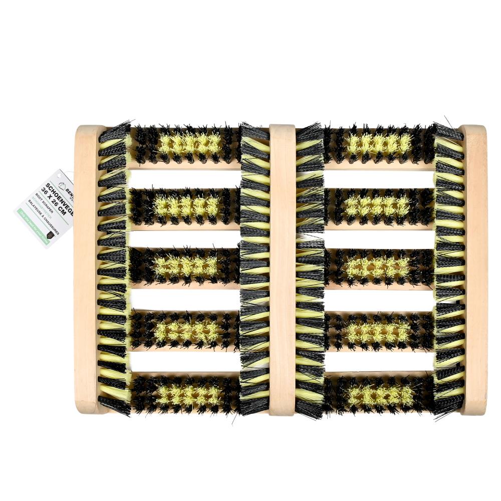 De basis van de schoenveger is vervaardigd uit robuust hout, wat niet alleen zorgt voor een natuurlijke uitstraling bij de voordeur, maar ook voor een lange levensduur. Met een formaat van 36 x 26 cm is de veger compact genoeg voor kleinere entrees, balkons of de instap van een caravan. De mat is geschikt voor zowel binnen- als (beschut) buitengebruik en is na gebruik eenvoudig schoon te kloppen of af te spoelen.