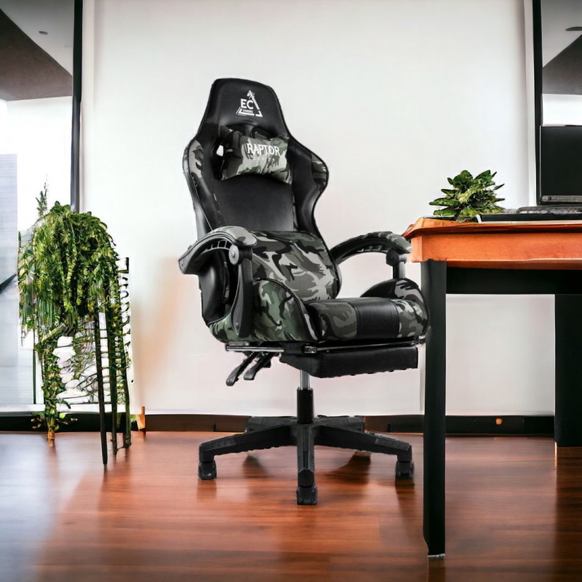 gaming stoel, camouflage gaming stoel, ergonomische gamestoel, verstelbare gamestoel, game accessoires, gaming setup, comfortabele bureaustoel.